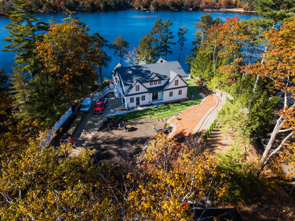 Giroux Brothers completed a full-scale residential landscape transformation featuring extensive hardscape construction, site regrading, planting, and lighting installations. The project began with the removal of existing timber retaining structures and significant excavation across multiple areas of the property, followed by construction of three new engineered block retaining walls. These included a 65-foot shoreline wall tied into an existing concrete slab, a 65-foot structural wall built with geogrid reinforcement, and a 44-foot wall replacing the deteriorated pump house structure. Each wall installation incorporated drainage stone, backfill, and careful finishing to restore disturbed areas.